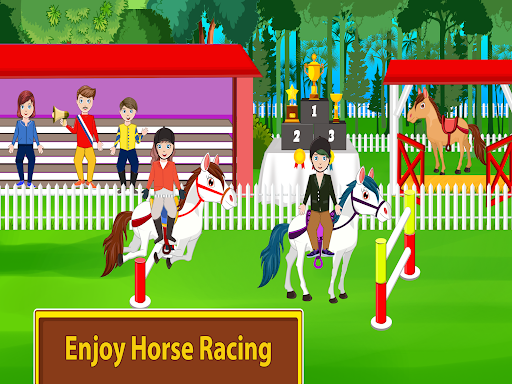 Once you've managed these tasks you will continue the cleaning in the stable and the pony's farm house. Follow the instructions and use similar techniques for restoring their places to get them cleaned. In this horse simulation game you have to set proper environment for them to grow as a pro unicorn farm manager. Show your girls & boys some real horse racing stunts while performing dressage. Show jumping with your princess horse and become a champion of this horse stable life. You have to be careful to satisfy all needs to make the cute animal happy and pleased about his condition. All that's left is to help him out in his race and do some interactive activities. Get him to run fast and get well through all the different levels in this pretend farm town. So, download and enjoy this horse stable life.