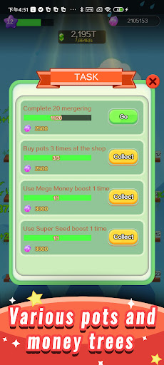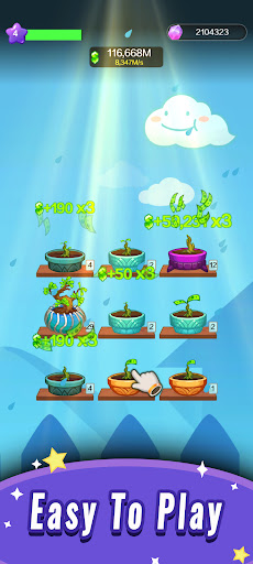 Money Tree is a simple clicker game. Place some pots and grow trees. Drag and drop same level tree together to get better tree.
