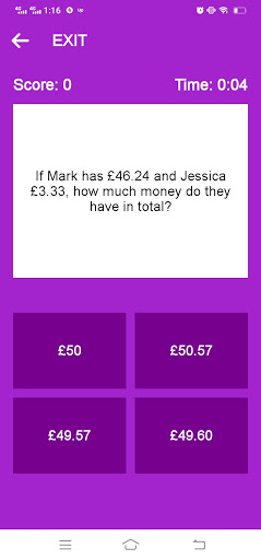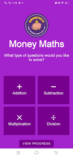 It is a simple game of maths where a user decides whether to practice addition, subtraction, multiplication or division. Upon the operation chosen the app displays scenario questions from which the user has to choose the correct answer out of four options presented.