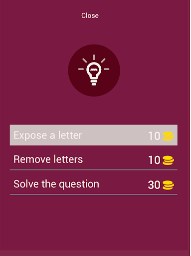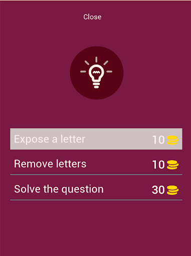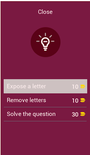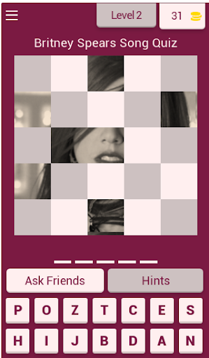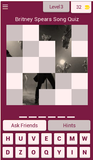 To play the quiz simply click on the tile to uncover the picture and type the name of the song. You can use the letters displayed at the bottom! Try to uncover as little tiles as possible! If you're stuck at one level you can use hints or ask your friends for help. Sharing our app on social media will help you get more coins!