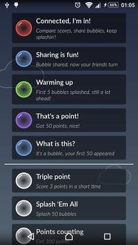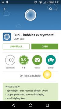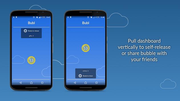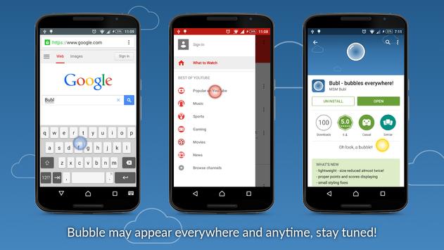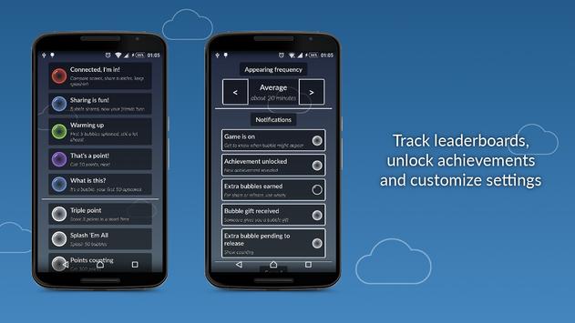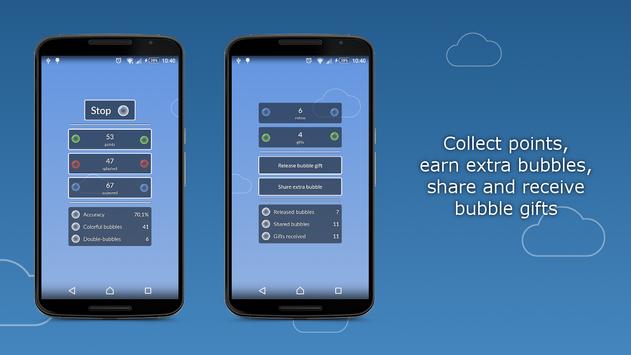 Splash every appearing bubble! Collect points and achievements, earn some extra bubbles occasionally, then release them for more points or share with your friends as a gifts. Use bubble as a poke, notifier, some disturb while working on your device or... just as a bubble :) You may also check out statistics on Google leaderboards (after logging in).
