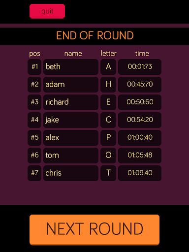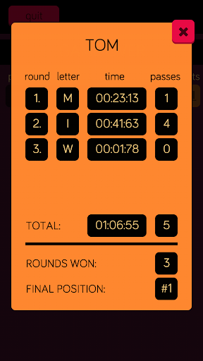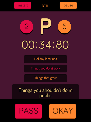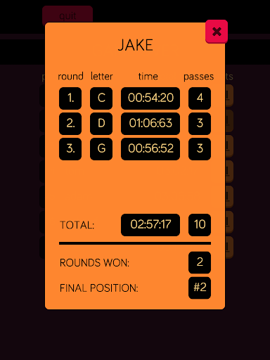 *Variable settings - adjust the settings to adapt the game to any group scenario. Rounds can be made easier, harder, longer or shorter by increasing or decreasing the maximum number of letter re-rolls, the maximum number of in-game passes, pass time penalties, questions per round, and rounds per game.