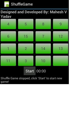 Shuffle game is a brain teaser game. Click 'Start' button to start the game. Initially all the numbers are shuffled and displayed in random order. Arrange the numbers in ascending order from left to right. Click on any number which is either left, right, top or down to the empty button.