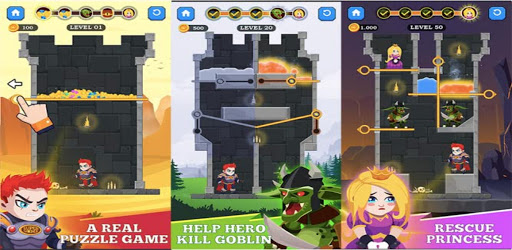 Solve puzzles and rescue the hero, collect all the treasures, kill monsters and save the princess. Pull the pin in order to destroy your enemies by pulling lava and poisonous gas into their puzzle units. Cut the ropes in order to rescue the princess from the scary monsters.