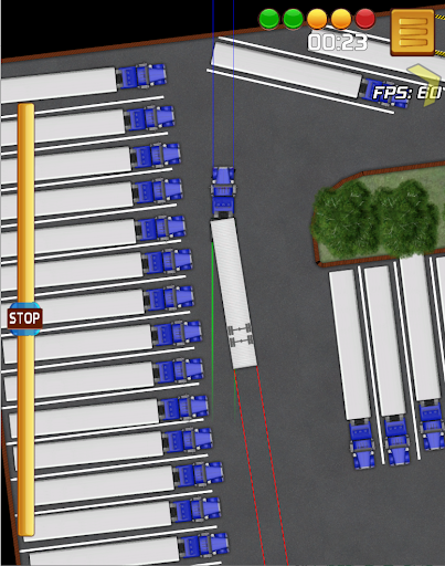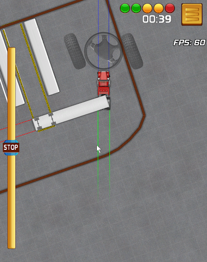 You will find that there are RED, Green, and blue lines that are on the truck and trailer. There is a REALLY big reason for this. Without these lines, I think that the trucking game would be unnecessary hard. The red line shows you the direction that the back of the trailer is pointing towards. And if you have ever seen my videos before I started using this heavy truck simulator game to demonstrate backing, I always had RED lines showing where the trailer was pointing. I have found that it is very hard to see that without the red line in a game that is a top-down view (aerial view). The green lines are to show you how straight your truck and trailer are. Just like in the real world all you have to do is look in your mirrors to see if you are straight. The blue line not as important but I added them anyway because a top-down view does not always give you a good indication of where you are driving towards when your steers are pointing straight. I do love my lines.