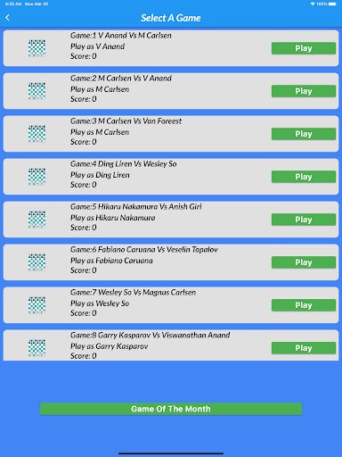 Play games from famous Grandmasters like Anand, Magnus Carlsen, Bobby Fischer, and Garry Kasparov