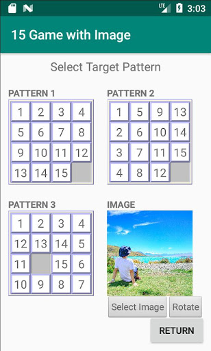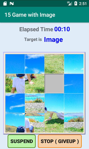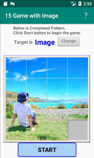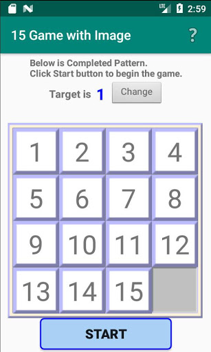 This is a traditional 15 Game known well since before.There are 4 x 4-1=15 tiles and 1 missing on 4 x 4 square board. Aim is to make the target tile layout ( Target Pattern ) by sliding tiles to the missing space. Click Start button, and game-screen appears, that is random order tile-layout. Let's try to complete in the shortest possible time. If you achieve the shortest time, it will be saved into memory.The target pattern can be changed by clicking Change button. Not only Number but also Picture/Image is available as target pattern. When you want to take a break,