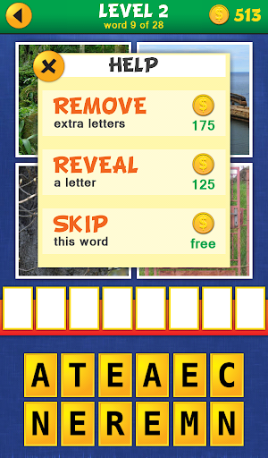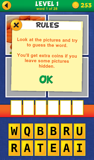 • The pictures are revealed one by one. Guess the word with less pics and earn extra coins!