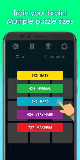 √ Five modes of difficulty levels (3x3, 4x4, 5x5, 6x6, 7x7)