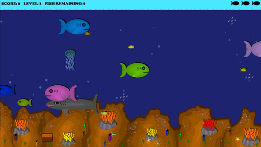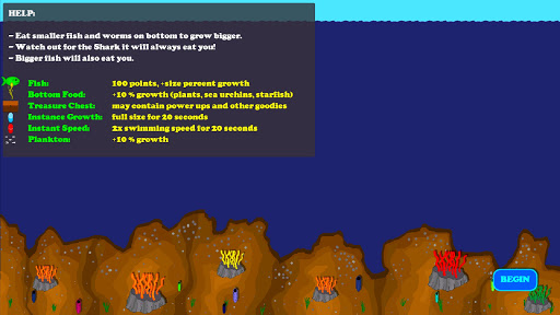 Bigger fish eat smaller fish. Eat bottom food such as plants, sea urchins, and starfish or eat smaller fish to grow bigger and bigger. Watch out for bigger fish and also SHARKS! Sharks may even chase you down and try to eat you!