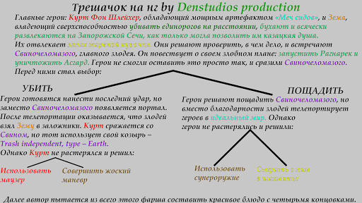 Среди 8 человек был проведен конкурс. Имелся скелет сценария (по типу: (кто?) пошел (куда?) с собой имел (что?) и т.п.), и каждый из участников должен был ответить на одни из этих вопросов (не зная, само собой, что отвечают другие). После этого автор (т.е. я) должен был по дополненному сценарию сделать небольшую игру. Вот, собственно, что из этого вышло. Со сценарием можно ознакомиться ниже (разными цветами обозначены ответы участников; каждому участнику соответствует свой цвет).