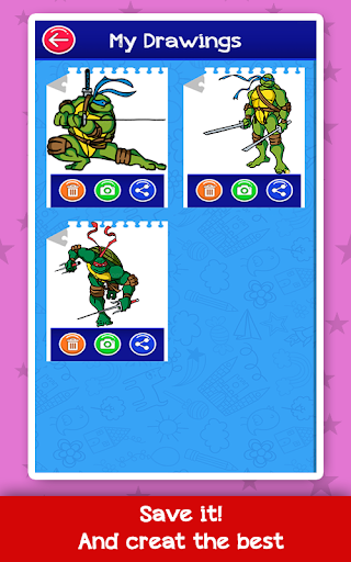 Creativity is tested by coloring, drawing, painting and decorating works with multiple stamps and graphics of many amazing characters of your favorite ninja of turtle's super heroes mutant's.