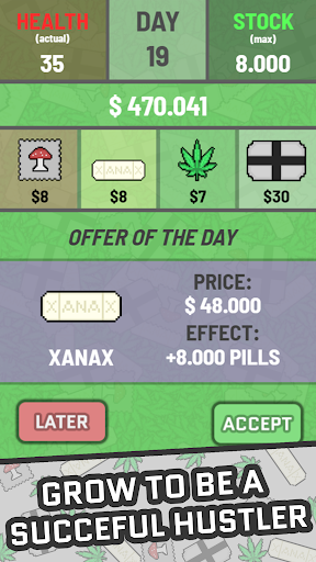 The random 'offers' throughout the game let you make some cash quickly – don’t miss them. The price of drugs will be low, and you could make a lot of profit. You're also able to buy this with lent money. The 'offer' also includes a bag which allows you to carry more drugs. Prove that you can manage the money wisely in a super-interesting selling drugs game.