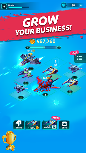 Build your empire and become galaxy tycoon. Buy, merge, manage your cyber planes and upgrade them! Each level of spaceships earns more coins and speed. Choose strategy and enjoy journey.
