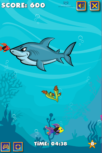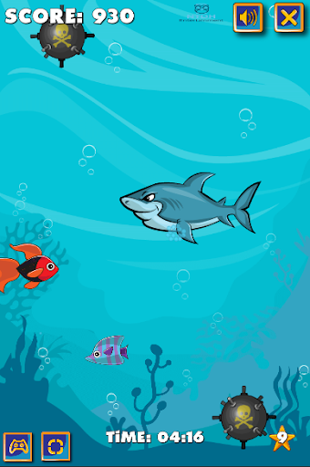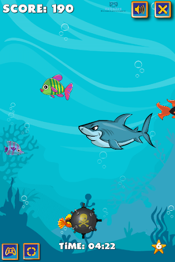 This shark is starving, feed him with some fishes, but be careful, the more he eats, the more he'll get fat and won't avoid bombs anymore! Collect algae bonuses to shrink back to the original size, starfishes and hourglasses to get more points.