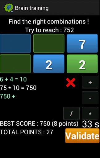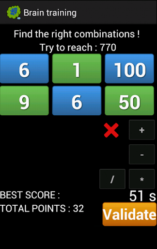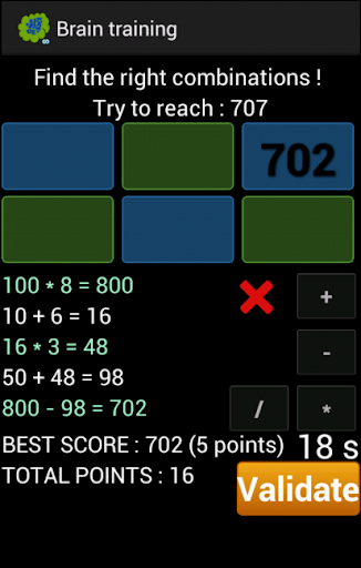 The second way consists in playing with numbers. You have one minute to find the right combination between six given numbers in order to get the given target number. With the six given numbers, you can add, subtract, multiply or divide them, and you are not obliged to use all of them. While you will be trying to reach the target number, the closest number from the target you will succeed to get will be recorded. If you succeed in getting the target number, then the count down timer stops, you get 10 points that are added to your total score, and a game restarts with other six numbers to combine, and a new target number that you have to reach in less than one minute. If you have not succeeded in getting the target number, so you may get some points according to the distance between your reached number and the target (for example, if you have to reach 432, and if you reach 430, so you don't get 10 points but 8 points).