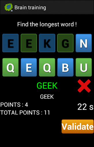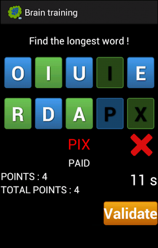 The first way consists in playing with letters. You have one minute to find the longest words existing with ten given letters. This can be really hard, and you have to imagine a lot of combinations with the given letters in order to find the longest word you know. At the end of the minute, the longest word you found is kept, and your total score is added by as many points as the longest word length (if you have found a 4 letters word, you will get 4 more points to your total score). After that, it restarts with 10 new letters, and it is up to you to find the new longest word ! You will see, it is very addictive... Try to beat the best scores posted, even if it will be harder and harder.