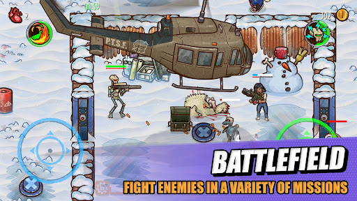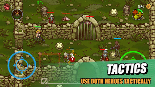 In a simple but very effective way, you control two heroes who cover for each other and help each other with their weapons, experience and skills. Each hero can be upgraded and equipped with buffs in each mission to multiply their strength and abilities.
