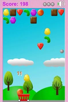 When the ball hits a sweet at the top of the screen, it may dislodge it and the sweet will drop to the ground. Use your trolley to catch the sweet before it lands on the ground.