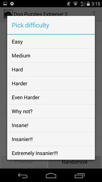 Easy, Medium, Hard, Harder, Even Harder, Why not?, Insane!, Insanier!!, and Extremely Insanier!!! And has 3 wonderful dog pictures to choose from.