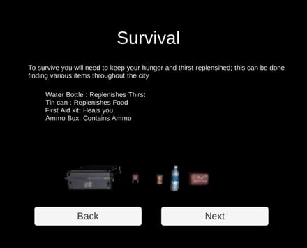 Your objective is to try and survive for as long as you can in a zombie infested city, you will need to find food and water to survive, these can be found in some of the buildings and alleyways throughout the game or maybe helping a survivor or two to safety will reward you!