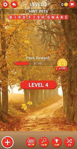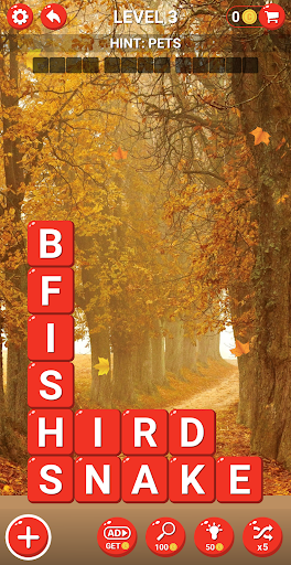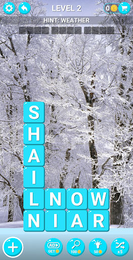 Each levels provide different difficulty. Game levels is divided in some theme appearance such as rain, winter, night, and many more. Correct swipe the letters horizontally, vertically to form a specific hidden word.