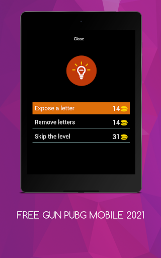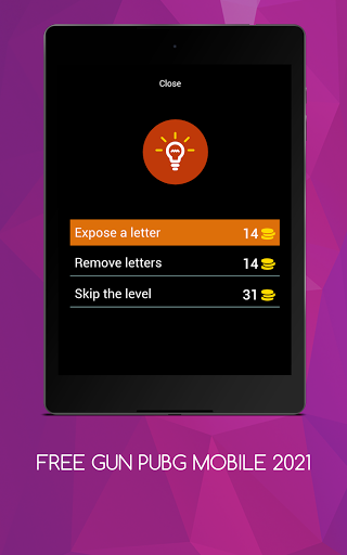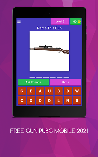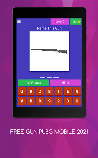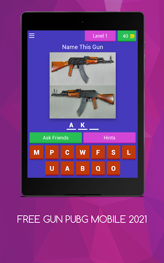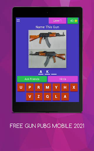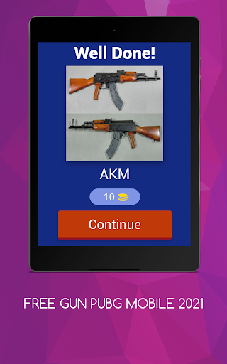 Hello everyone, This is a gun guessing game, Guess the gun in the game pubg mobile FREE GUN 2021, It's not a game pubg mobile, In this game, I just quote the guns we use during combat in pubg mobile, To let you all know more about it,