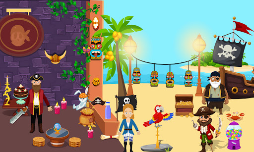 Pretend play and create your own stories become pirate captain navigate your outlaw crew across ocean on treasure hunting voyage. Play role of pirate in a ship sail over ocean follow treasure map you found on lost island. Rule your ship like a king and use your pirate mates to sail ship in stormy night and plunder gold from merchants. Search for hidden treasures on Ancient Island plunder gold coins and jewels in the best pretend play pirate ship game. Use map to found gold on Treasure Island and fill your pirate boat with gold and jewels.