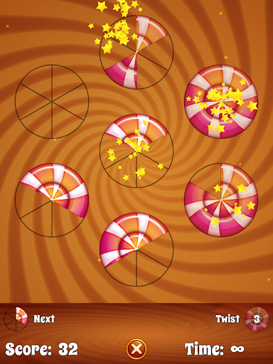 Tap the outer circles to place the current candy piece. Once a candy has been completed it will be removed form the board along with the adjacent pieces. If you run out of moves tap the Twist button for a second chance. But beware - if you run out of Twists, it's game over!