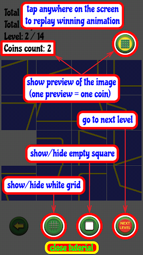 > Coin system: You will get 2 coins after level is finished. When you tap 'Preview' button one coin will be taken away and you will see preview of the image which you have to put together.