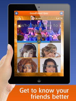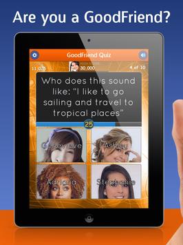 Are you a GoodFriend? Now's your chance to prove it! Take our extremely social quizzes and get the high score! Challenge your friends and work your way up our Leaderboard to become the best GoodFriend! *Note: Requires Facebook Login Authentication