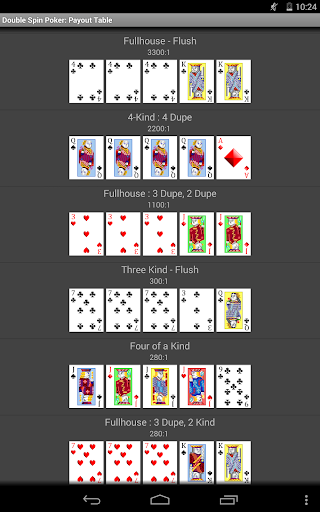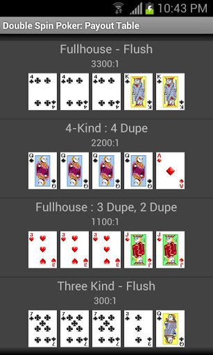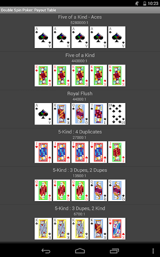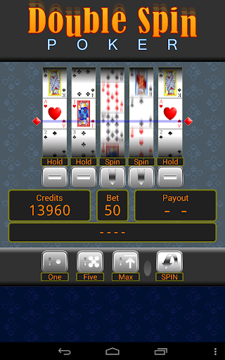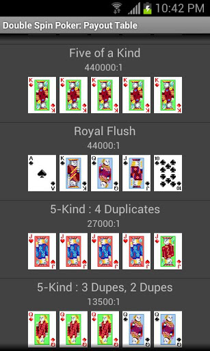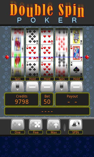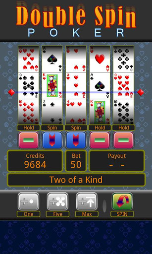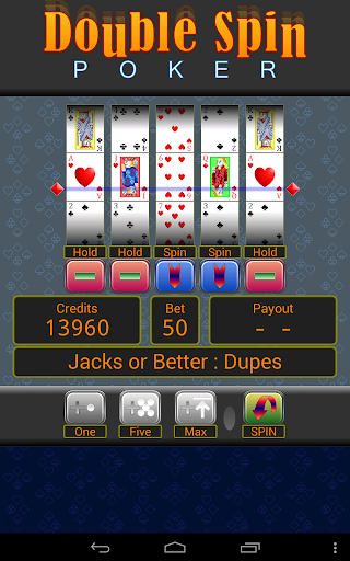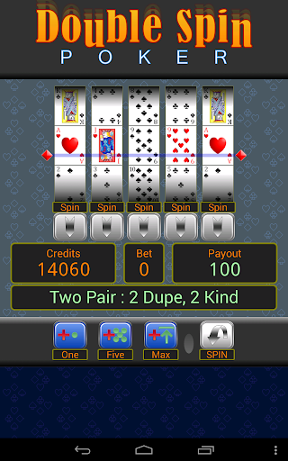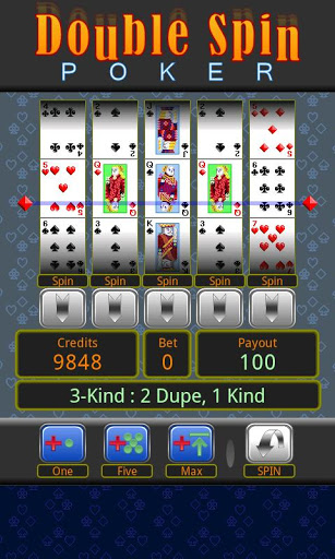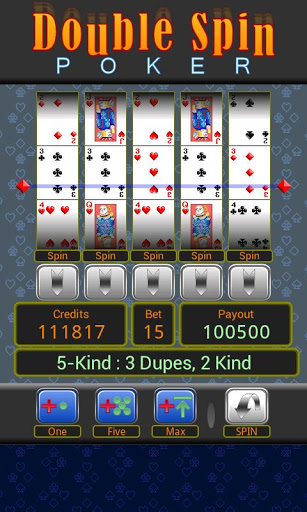 Double Spin Poker is a five card draw poker game, played with five card decks on a five wheel slot machine! This game offers 380,204,032 unique combinations and 37 types of winning hands, many not possible in traditional single deck poker.
