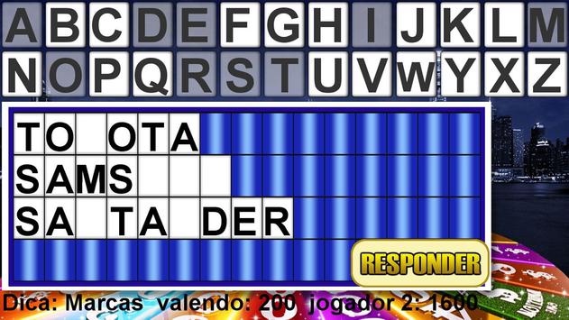 O seu objetivo é descobrir a palavras secreta. A cada rodada você roda a roda e escolhe qual letra você acha que existe nas palavras secretas. Se souber a resposta você pode clicar no botão "Responder" e escrever quais são as palavras. Cada vez que você rodar a roda ela irá parar em um valor, esse valor será multiplicado pelo total de letras que você acertar das palavras secretas e o valor total será adicionado a sua pontuação total.