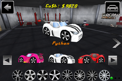 BUY and CUSTOMIZE your cars from a list of 9 UNIQUE MODELS with 3 PAINT JOBS each and 8 different RIMS!