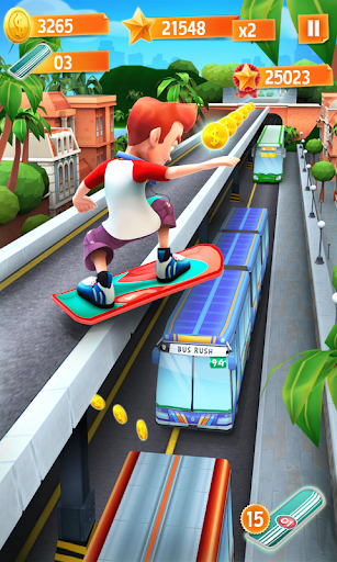 The Bus Rush Store has lots of items to improve your running performance. Get runner upgrades to improve your power ups (including magnets and boots). Upgrade your jetpack too, and get lots of coins. You can also purchase Boards to surf mid-air and survive obstacle hits —whether you hit buses, trucks or even subway trains!
