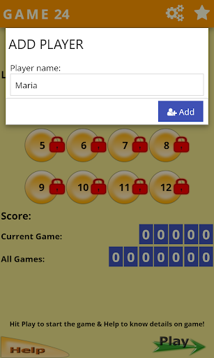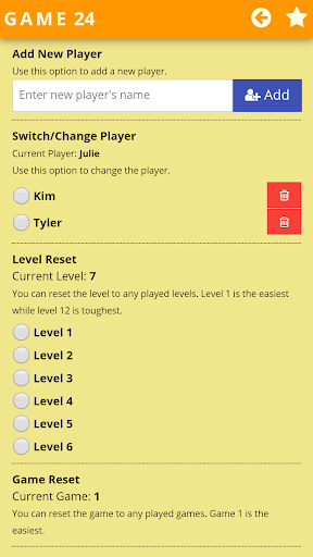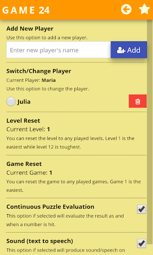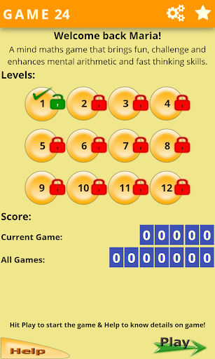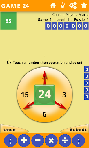 There are 12 levels in each game and each level consists of 25 puzzles. Level 1 is the easiest while level 12 the toughest. Game starts with level 1 and moves to next level when all the puzzles are solved correctly. The default target is 24, you can change it to a dynamic target by going to settings. For continuous evaluation, turn the evaluation mode by going to settings.