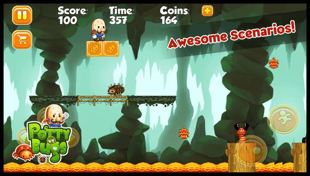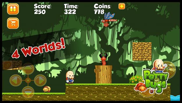 The bugs enemies are in the 80 levels and 4 worlds. 8 final bosses waiting for you in a castle. Every corner full of insects awaiting your arrival. Difficult challenging obstacles. Jump, run, find secret places, fly to the sky, all in many different scenarios: meadow, jungle, desert, cave, castle, ocean and sky.