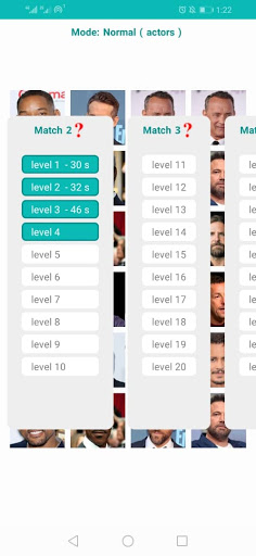 MatchUp people picture game has three modes, each mode contains 60 different levels. Evey mode has different styles of matching images which are: match 2 picture, match 3 pictures, mirror 2 pictures, mirror 3 picture, match 4 picture, and mirror 4.
