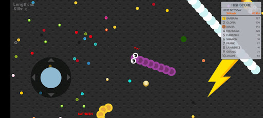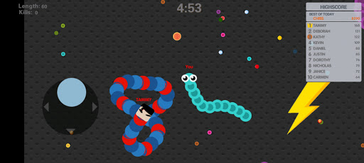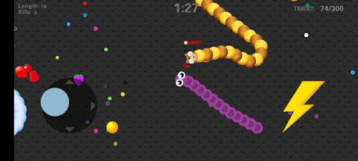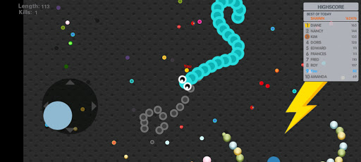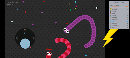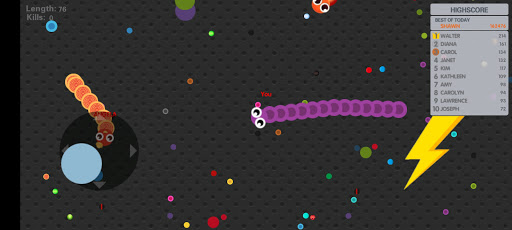 Slide ahead of other snakes to kill them and eventually eat their light dots.