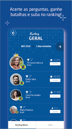 A cada desafio você pode ganhar diferentes tipos de recompensa - pontos, que podem garantir a liderança no ranking geral ou por tópicos de conhecimentos. Ganhe moedas e troque por power-ups (poderes extras) como tempo extra, pontuação dupla, entre outros, que vão ajudar em sua estratégia de evolução para conquistar a liderança.