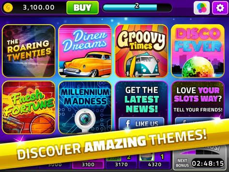In Your Slots Way trip you will WIN BIG, enjoy great bonuses, mini games, free spins and other countless opportunities to win free coins! You will party in the 20’s, make peace in the 60’s, dance in the 80’s and much more.