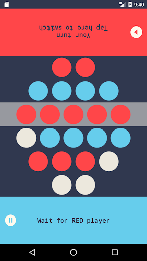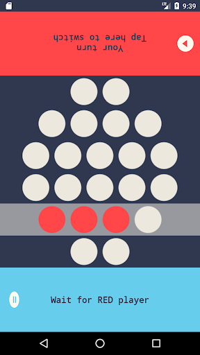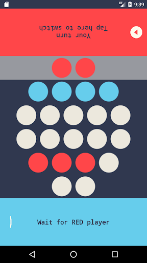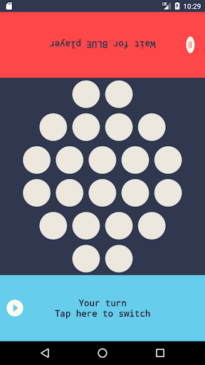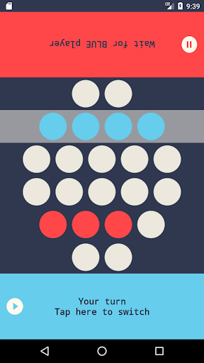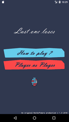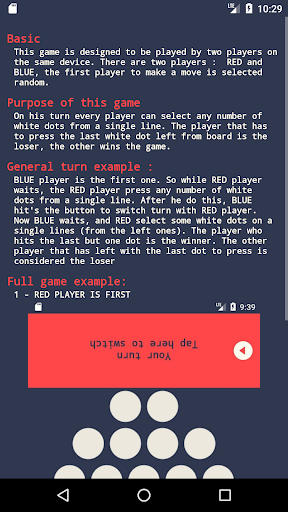 BLUE player is the first one. So while RED player waits, the RED player press any number of white dots from a single line. After he do this, BLUE hit's the button to switch turn with RED player. Now BLUE waits, and RED select some white dots on a single lines (from the left ones). The player who hits the last but one dot is the winner. The other player that has left with the last dot to press is considered the loser,