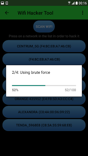 Choose the id of one of the wifi networks from this list. After a simulation of hacking a fake generated password will be displayed, as if the target network was broken into. See how amazed your friends are by your hacker talent and enjoy!