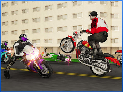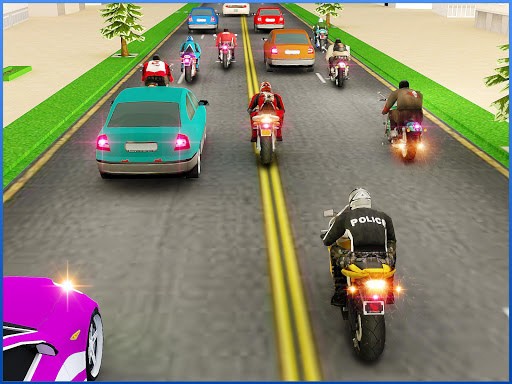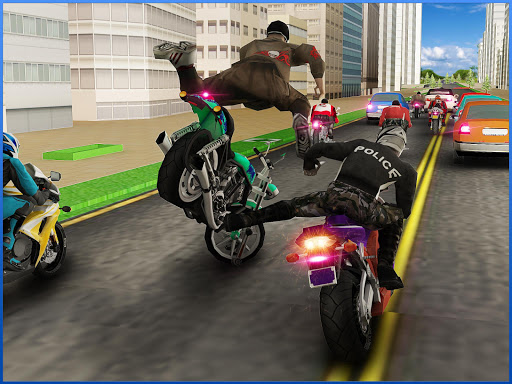 Race and chase gang fighters and battle with riders. Beat your bike rivals and be the best police officer of robo city. Shoot the criminals and gangsters while you drive your motor bike in high speed. The ultimate highway stunt racing is here with real fighting simulation where you can kick and punch mobsters on the big city highway. Make them hit the cars and truck on the roads and dodge the traffic. Don’t let them knock you out on the rush!