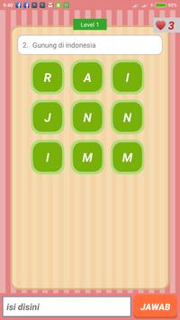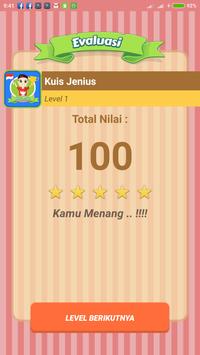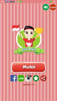 Kuis Jenius adalah permainan edukasi cerdas cermat yang menguji pengetahuan dan wawasan dalam bentuk soal-soal. Ada pilihan bantuan untuk menjawab soal yaitu 9 huruf untuk tebak kata jawabannya. permainan ini seperti game kata misteri di Teka Teki Sulit - TTS Lontong, hanya saja soal-soalnya lebih edukasi.