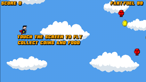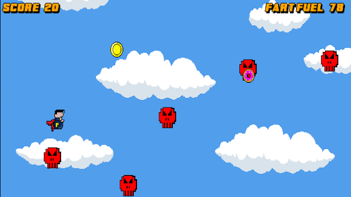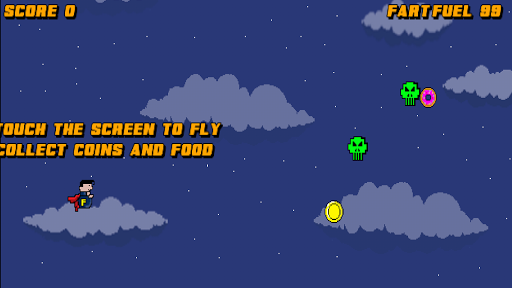Help Fart Hero fly through the skies using his humorous sounding farts and do not forget to collect the coins and food that come along the way. Be CAREFUL of the enemies, they are waiting to kill our hero. Go Fart Hero! Guarantees hours of laughter!