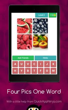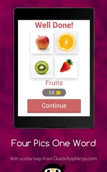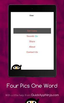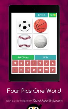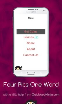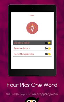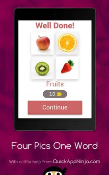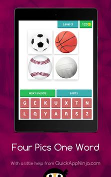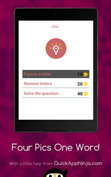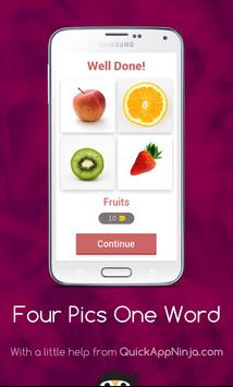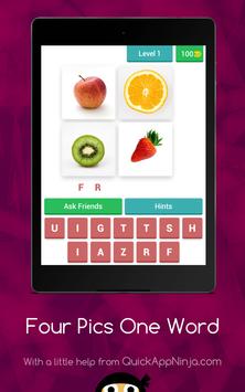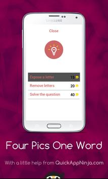 This is a simple word game, leaving many in endless fun! Just simply click on the levels to reveal the pictures, and then tap on each of the letters to spell out the word that goes with all of them! If you are correct, you will earn coins, that you can then spend on hints or revealing letters! There are currently only some easy levels, each with four pictures! There is also not a way to buy any extra coins, so no in-app purchases are necessary! Soon to come are more levels, with harder, more complex levels, and more pictures and words. Just get started, and play this straightforward word game!