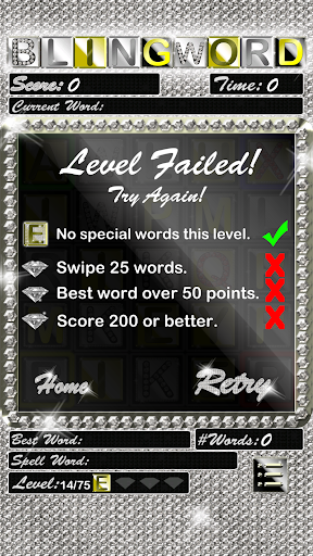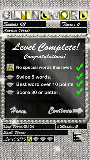 The letter tiles are random allowing you to use your imagination to search for ANY words and/or spell the pre-selected words in the games level. You can even swipe non-words to remove the letters so you can create “Bling” words worth lots of points. The more “Bling” in your word, the more points it's worth.