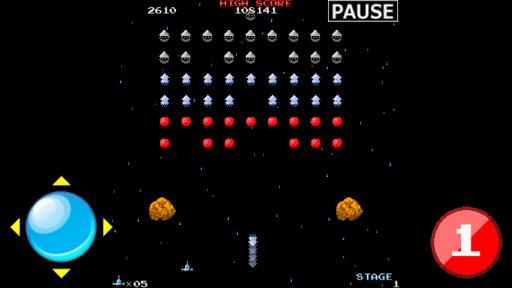 白黒画面で左右にのみ移動出来る、昔懐かしいモードです。自機を守る壁があるため、ある程度敵の攻撃を防げます。
