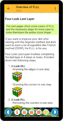 If you want to improve your skills after training with the beginner method, but you don't want to learn a lot of algorithms like in the Fridrich Method, the FLLL(Four Look Last Layer) is your choice.